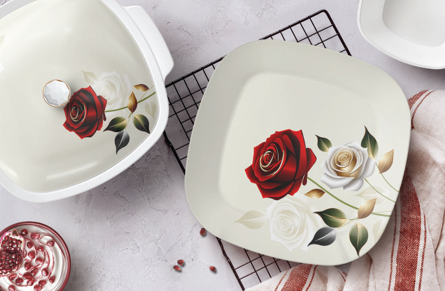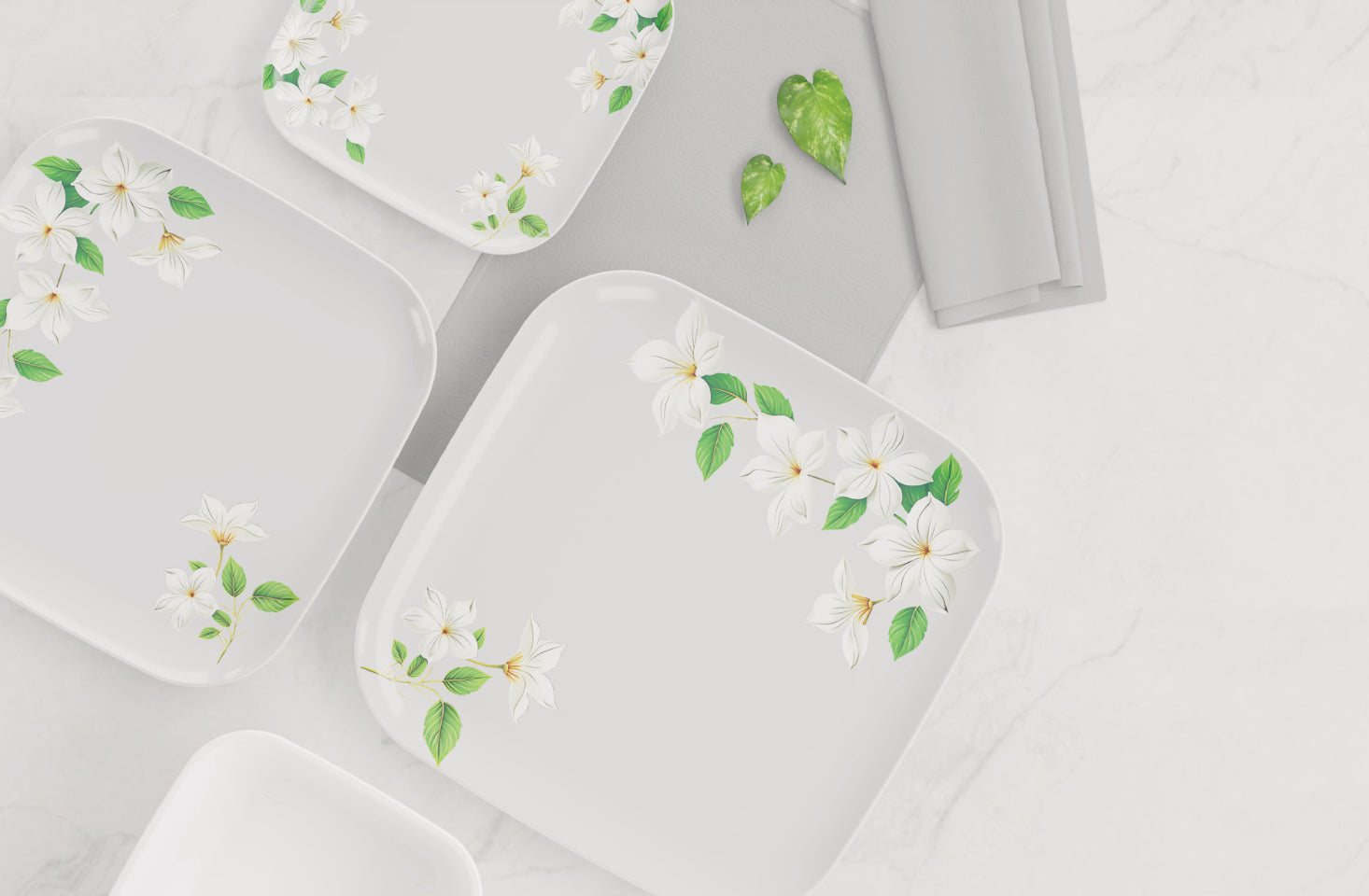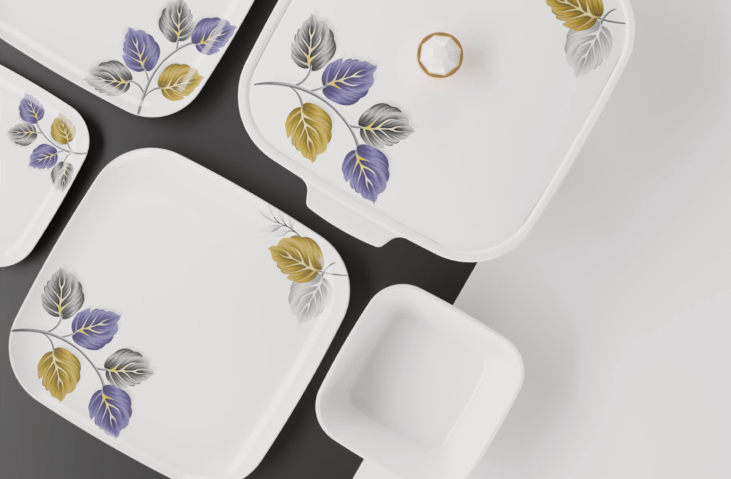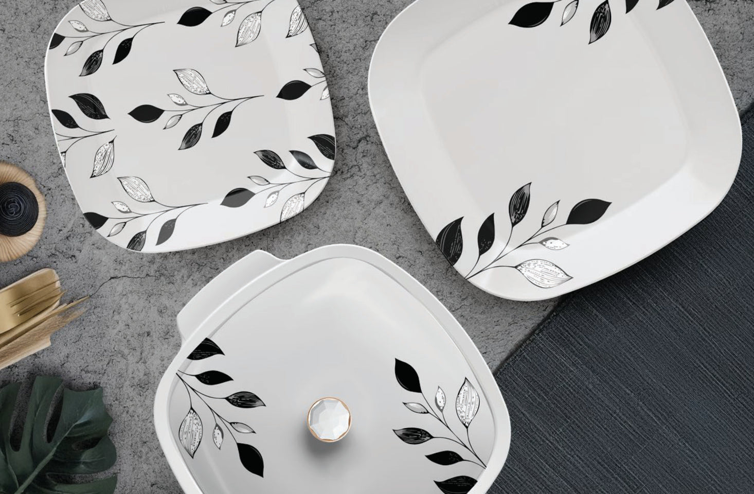 Stackable plates and bowls ensure convenience; taking up minimal storage space making it ideal for home display.