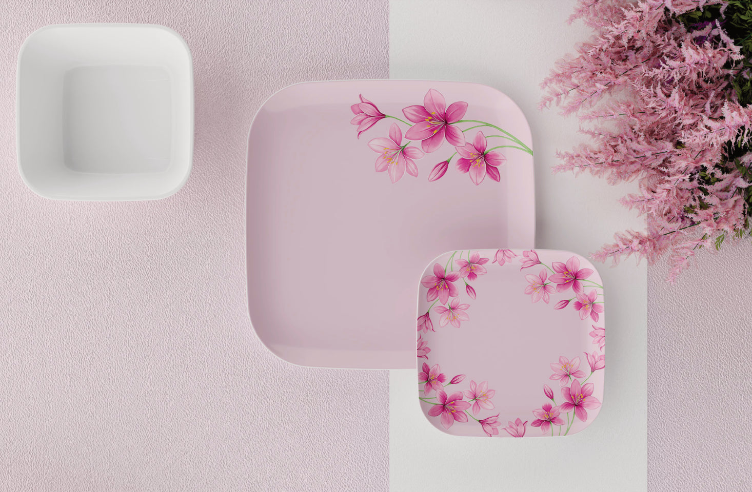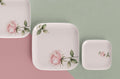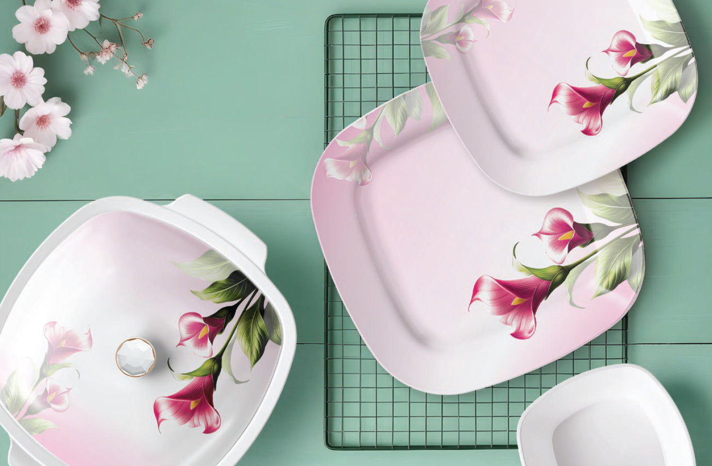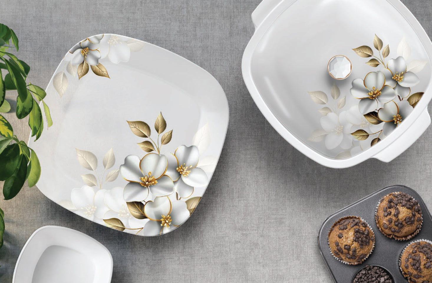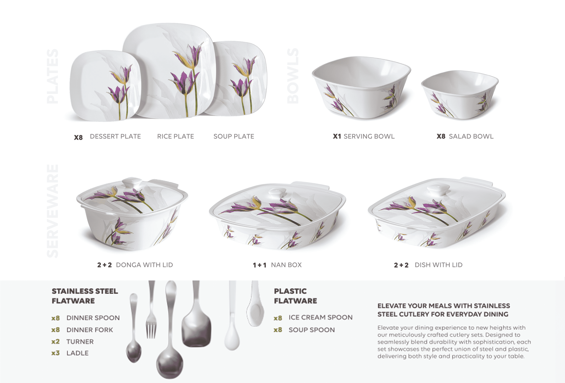 Stackable plates and bowls ensure convenience; taking up minimal storage space making it ideal for home display.