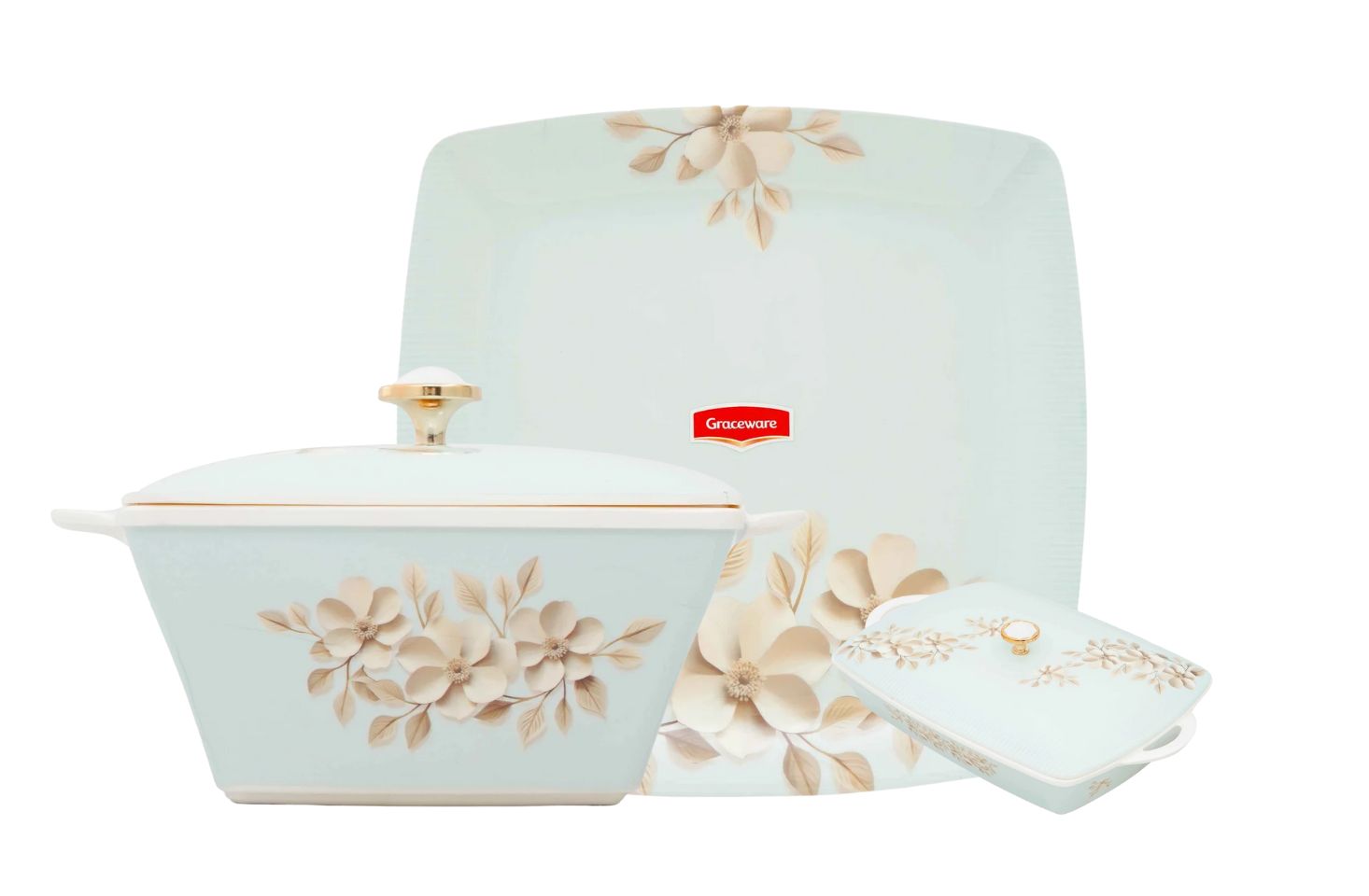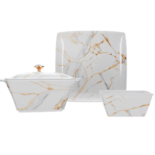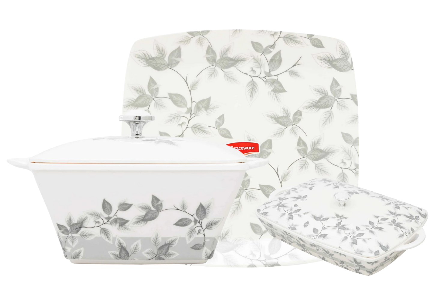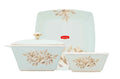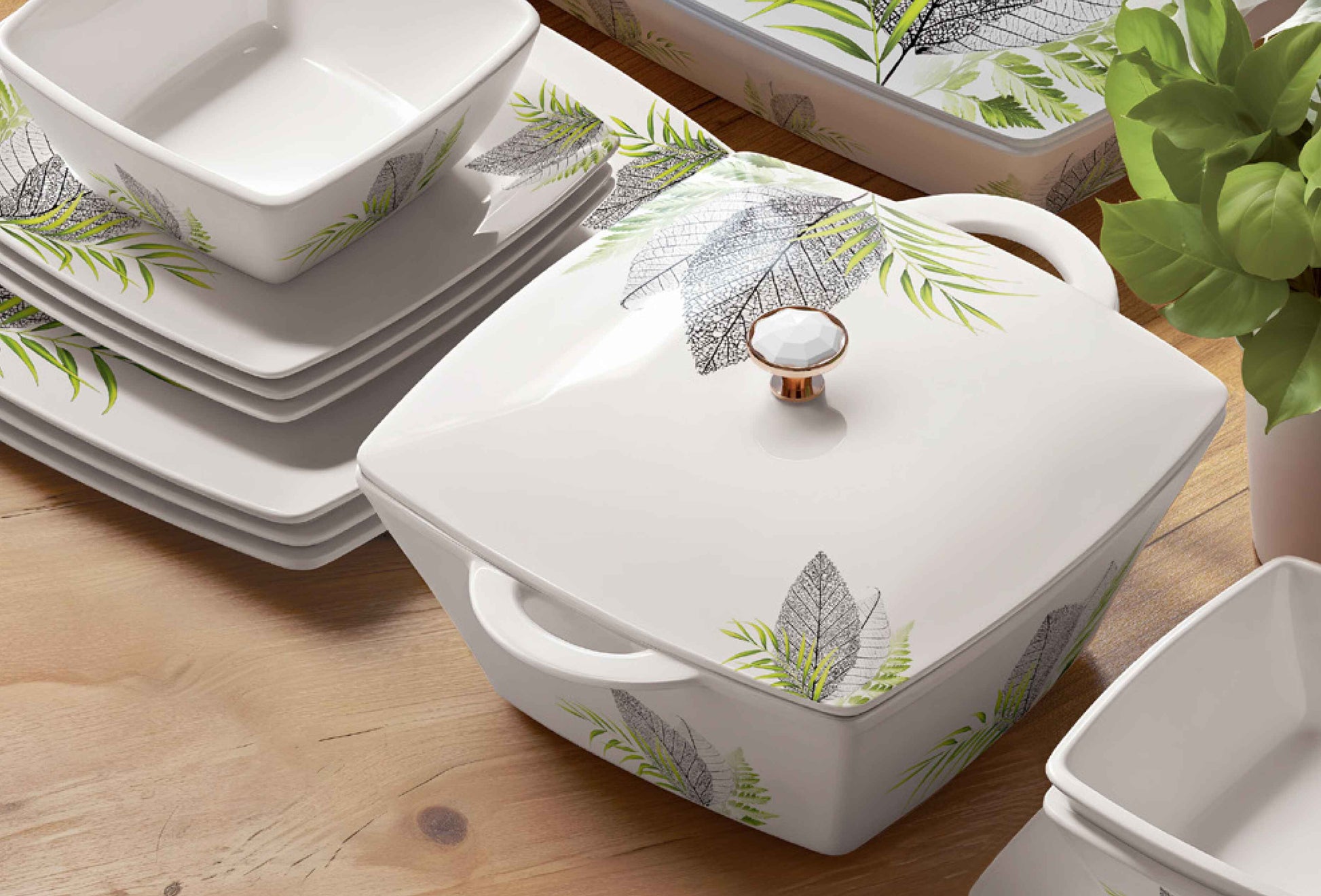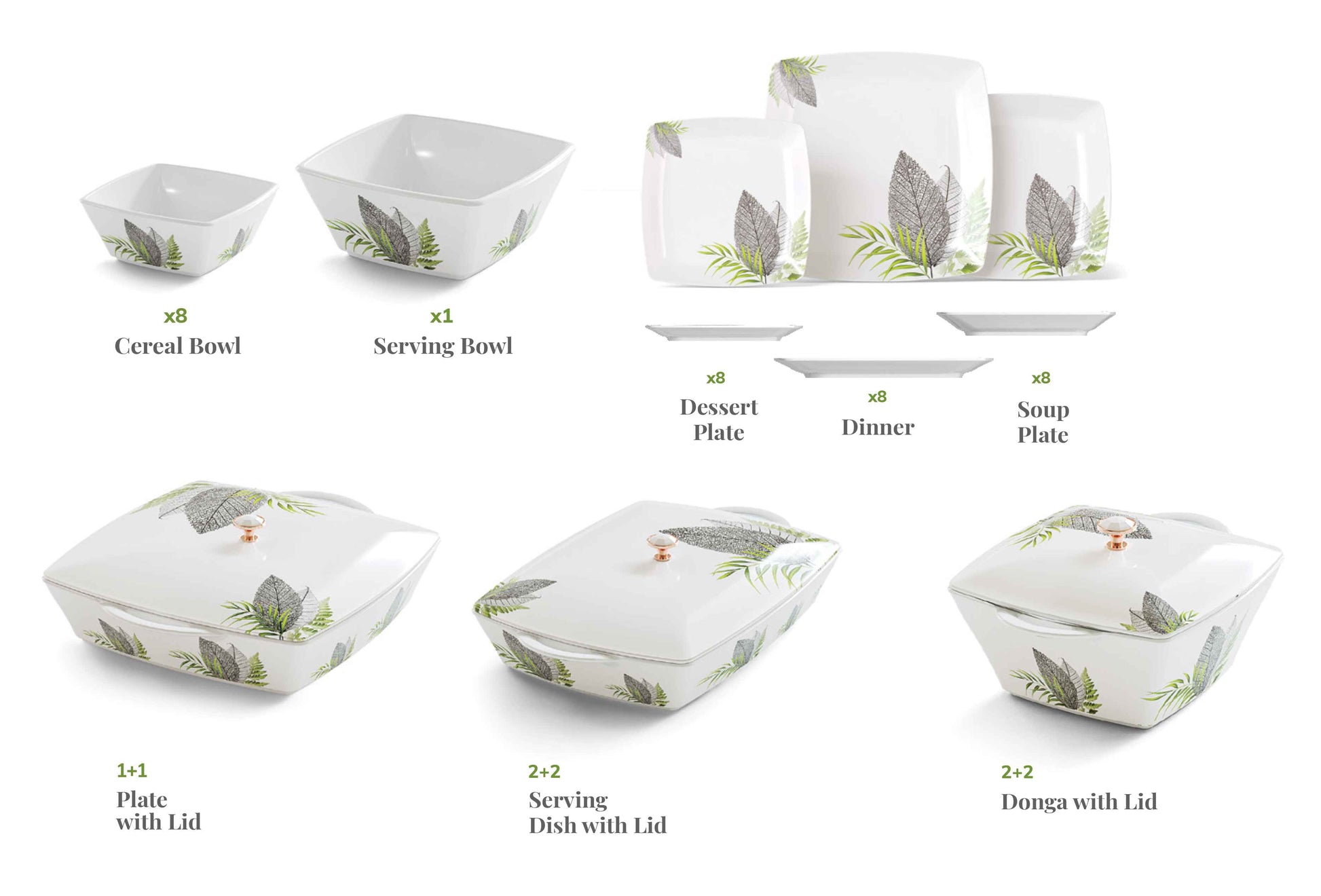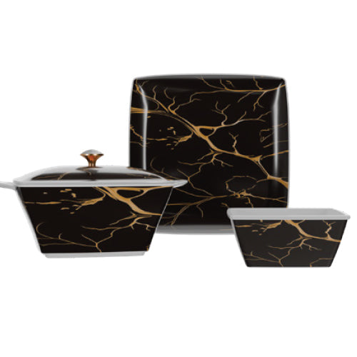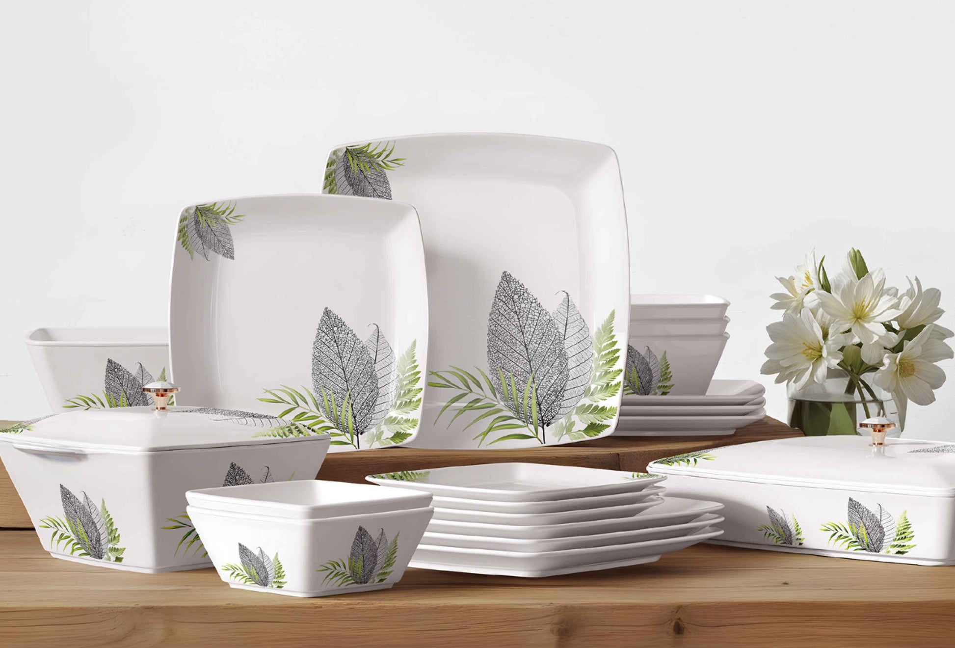 Stackable plates and bowls ensure convenience; taking up minimal storage space making it ideal for home display.