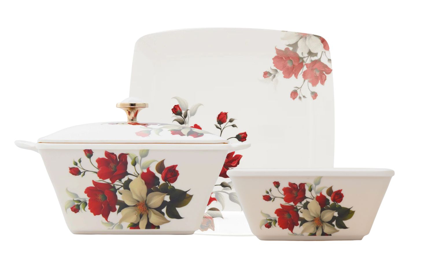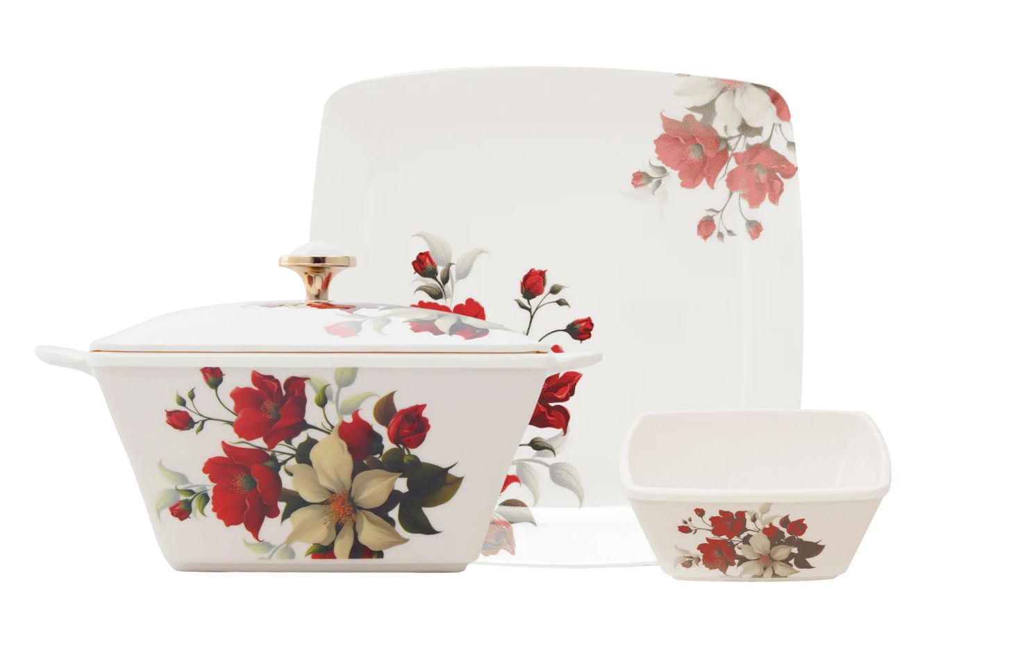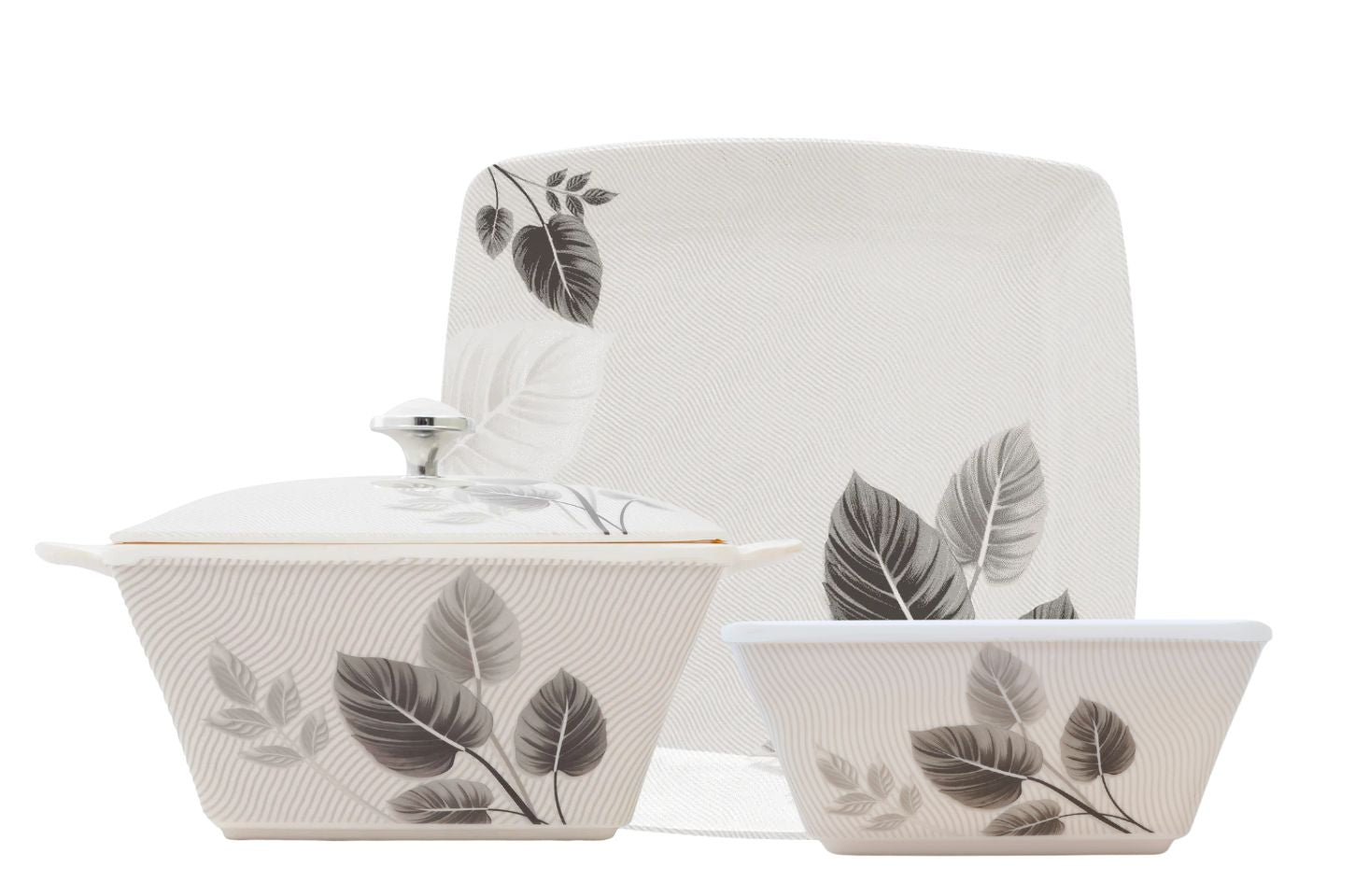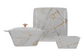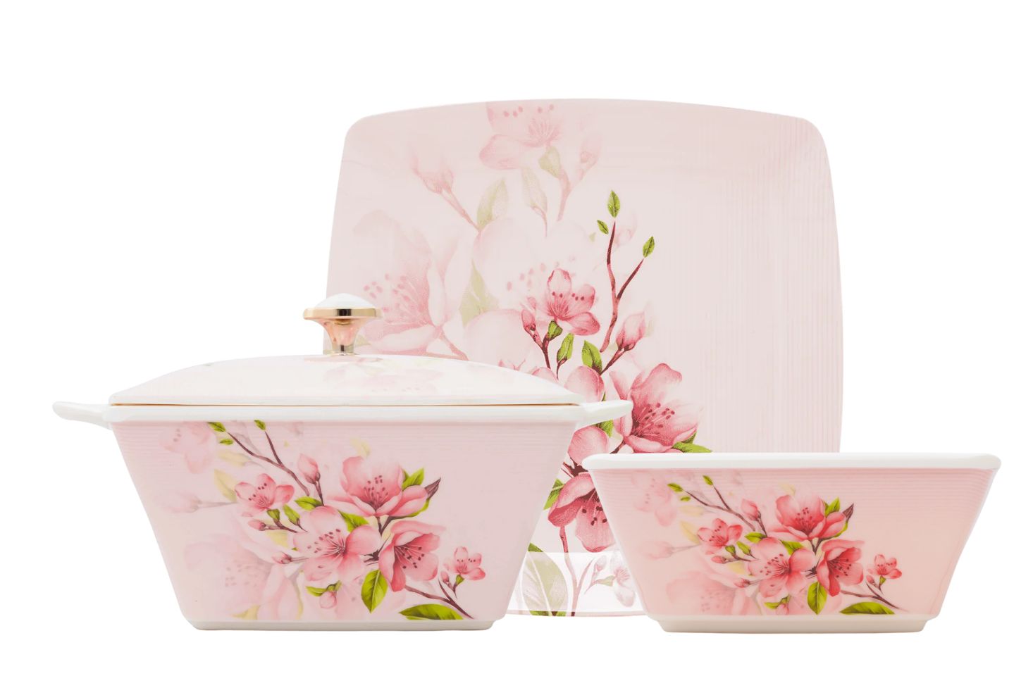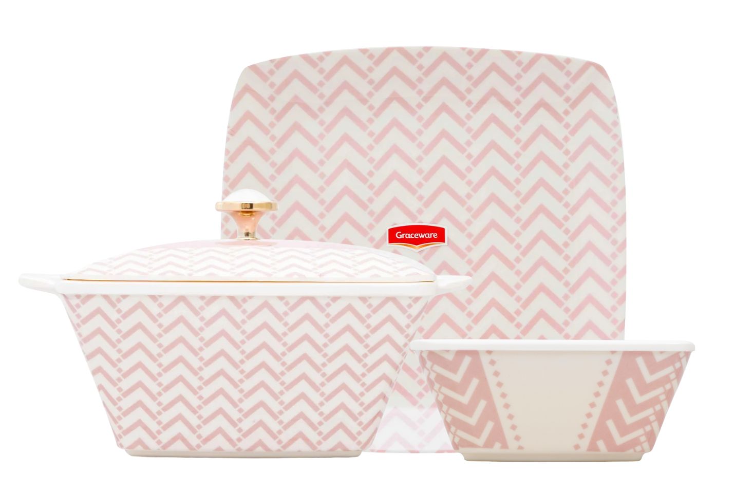 Stackable plates and bowls ensure convenience; taking up minimal storage space making it ideal for home display.